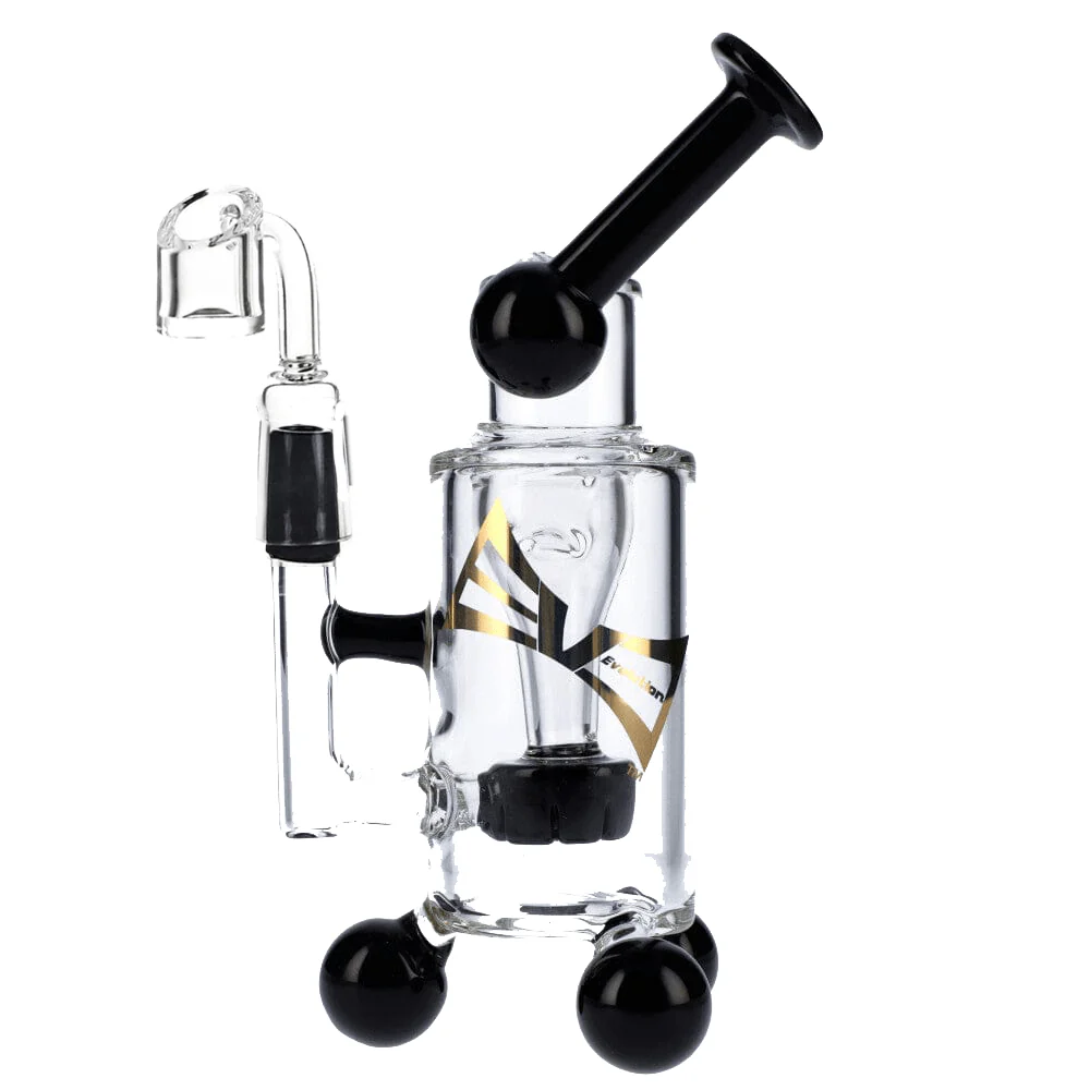 A close-up, angled view of the Mini Recycler Dab Rig, showing its clear glass construction and unique bubbler design.