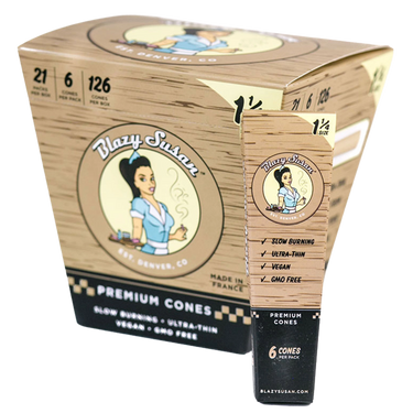 Keep your sessions natural and easy with Blazy Susan 1 1/4" Unbleached Pre-Rolled Cones. These premium unbleached cones come ready to fill, making them perfect for on-the-go use or whenever you want a quick, hassle-free roll. Packaged in a handy takeout-style box, they stay neat and ready whenever you need them.