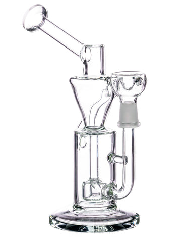 This scientific glass recycler has a unqiue design that enables incredible functionality. The main chamber of the recycler dab rig contains a barrel perc that provides amazing filtration and diffusion. Vapor travels from the 14mm male joint to the main chamber where it passes through the barrel percolator. From there, smoke and water travel through the seperation tubes to the cylinder-shaped recycing chamber located directly above the bottom section. The water and the vapor move in a loop, circling between the two chambers and passing through the barrel perc multiple times before exiting through the mouthpiece. The angled mouthpiece acts as a splashguard to stop any water from leaving the vapor rig. After you've hit this recycler, watch the water have a cool vortex effect as it funnels back down into the bottom chamber.