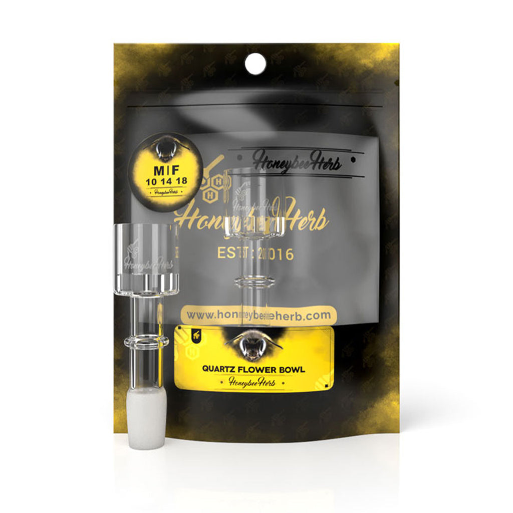 The Quartz Flower Bowl from Honeybee Herb is the perfect addition to your favorite flower water bong. It features a frosted 14mm male joint, 22mm bowl, and a convenient handle for ease of use. Entirely made of quartz, this flower bowl is both durable and looks amazing. It features a quartz screen that is in the shape of a star at the bottom of the herb bowl. This 14mm bong bowl is different than your standard flower bowl, which usually has a single hole at the bottom. This star-shaped design allows for amazing airflow and massive rips.