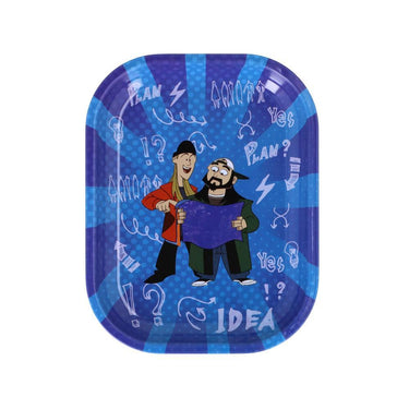 The “Think” rolling tray features Jay & Bob brainstorming on blueprints. It offers a smooth, glossy surface to roll on, complete with high edges and rounded corners.