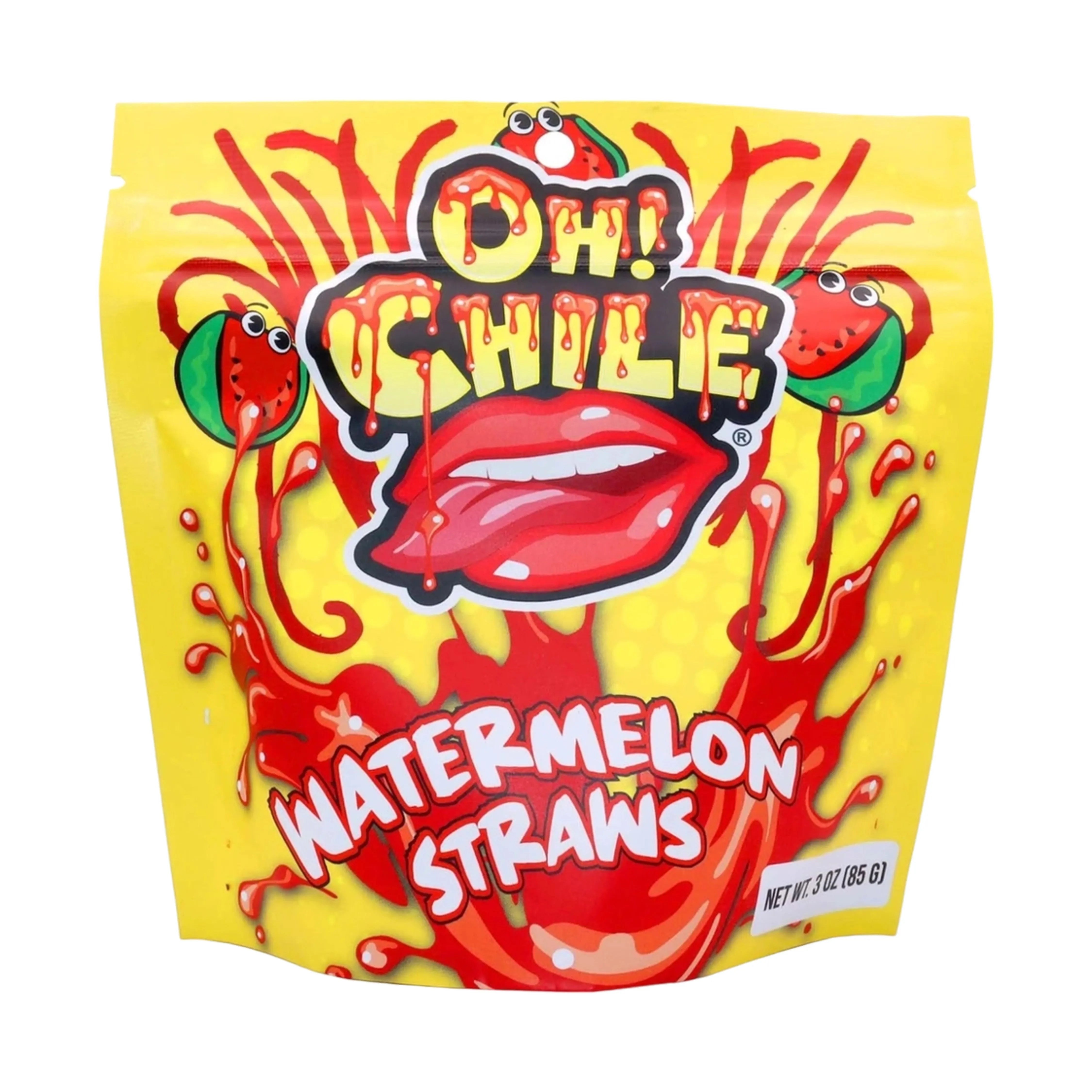 The Oh! Chile Watermelon Straws - 3 oz. is a mouthwatering, sweet, and spicy treat that combines the juiciness of watermelon with the bold flavors of chamoy and chile.